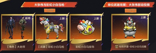 内个内个内内,阳光彩虹小白马,滴滴答滴滴答~~~大张伟与彩虹小白马趣味来袭。返场角色大老师带着新的趣味武器彩虹小白马枪和彩虹小白马挂饰来咯,还有联动排位武器——粘性手雷-彩虹小白马觉醒!