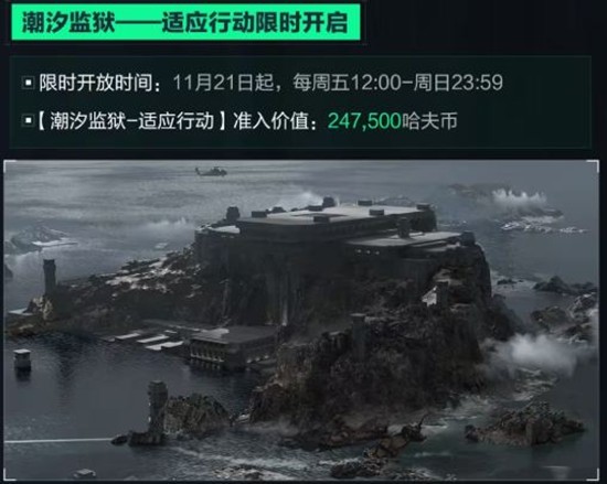 从11月21日起,每周五12:00至周日23:59,潮汐监狱——适应行动将限时开启。玩家需要支付247,500哈夫币才能进入,这将是一次考验团队协作和个人技巧的挑战。