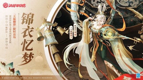 决战平安京祈霄玉晏系列皮肤即将在11月14日维护后至12月11日限时返场,本次返场为紧那罗、山兔、十六谷祈霄玉晏系列皮肤「天璇卿律」、「霓瑛琉羽」、「云瑶鸿珮」。这也是这三款皮肤的最后一次直售上线,机会难得,不容错过!