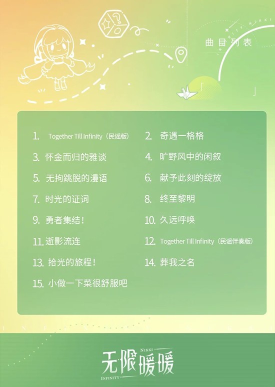 《无限暖暖》相遇即是奇迹全新OST正式上架音乐平台~专辑共收录15首由叠纸旗下原创音乐团队FoldEcho出品的原声音乐,欢迎搭配师们前往QQ音乐、网易云音乐、酷狗音乐、酷我音乐进行收听~