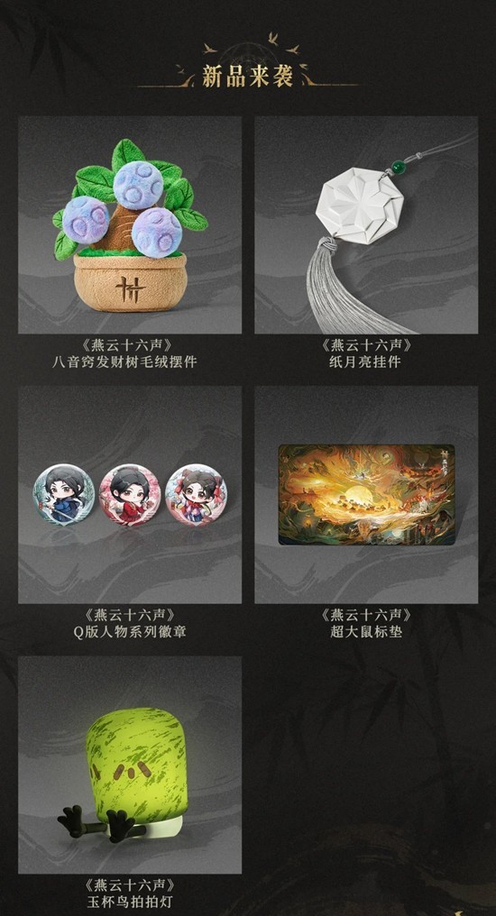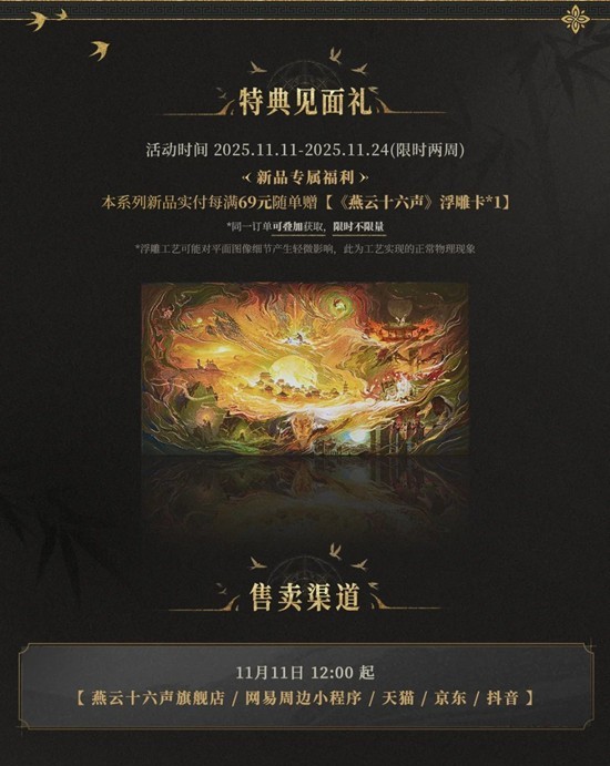 燕云十六声官方周边今日上新,首发满赠浮雕卡~11月11日12:00-12月11日,首发期(11月11日12:00-11月24日24:00)购买本系列新品实付金额每满69元赠限定《燕云十六声》浮雕卡*1张,《燕云十六声》官方周边今日上新,妙趣横生,让贴心之物点亮幸福感。 燕子为游侠们送上周边情报!