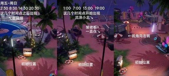 我们可以在这几个时间点前往社区,就有很大概率能够遇到夜猫猫。需要注意的是,寻找夜猫猫必须进入社区场景,如果在古堡房附近没有找到,建议切换到海岛社区进行寻找。