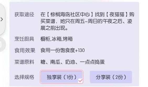 在规定的刷新时间段内,玩家可以在泳池旁边的楼梯处发现夜猫猫的身影。夜猫猫身边通常会伴随着薰衣草,其外观特征是全身纯黑色,非常容易辨认。找到夜猫猫后,玩家就能获得贪吃飘飘的食谱,这个食谱需要使用捣蛋奶油、南瓜和糖等材料进行制作。