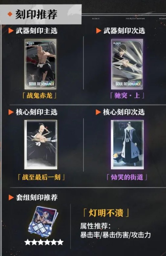 该刻印能全面提升斑目一角的技能强度,并额外增加暴击伤害,完美契合其高频输出特性。若暂时无法获得战至最后一刻,恸哭的街道可作为替代选项,尽管该刻印原为白哉专属,但在属性加成方面仍能有效支撑斑目一角的战斗需求,尤其在暴击率和技能倍率上有不错表现。