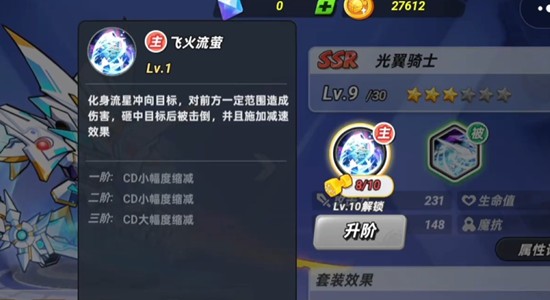 飞火流萤是骑士的核心技能之一。释放后,他会化作流星快速冲向目标区域,对路径上的所有敌人造成范围伤害。命中成功时不仅能击倒对手,还会附加减速效果,有效限制敌方走位。随着技能等级提升,该技能在进阶至三阶后冷却时间大幅缩短,使用频率显著提高,为后续连招创造更多机会。这一机制使得骑士在中短距离突袭中具备极强的压制力,尤其适合打乱敌方阵型或追击残血目标。