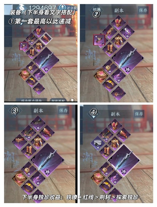 衣服袖子要两个不同的打造,出哪两个红色的打造就行,不追求紫或者金,但是要求基础属性一定要高(内功破防+元素攻击),比如你的衣服紫月隐基础属性750元素,那还不如1000元素的上赛季金色打造,所以要学会看基础属性算收益