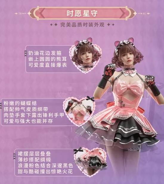 “星愿誓约”时装以粉色为主调,搭配精致的蝴蝶结和绑带,展现出一种甜美与力量并存的风格。女性角色的裙摆层层叠叠,薄纱搭配绸缎,粉色与黑色的结合营造出一种浪漫而神秘的气质。男性角色则以机械背心和深蓝光圈熊耳为特色,展现出一种优雅的绅士风度。