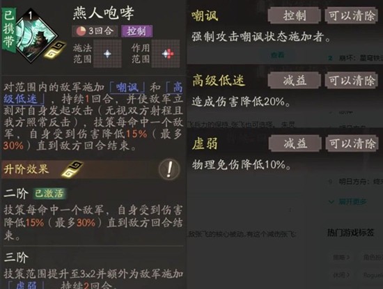 张飞的燕人咆哮是一个强控制技能,可以同时嘲讽多个敌人目标。嘲讽同时附加的高级低迷效果能使敌人处于非常不利的作战状态,即使敌人向我方发起进攻,也能将伤害降至最低。这一技能升级后可以扩大攻击范围,并给额外目标造成物理免伤降低,建议优先提升该技能等级。