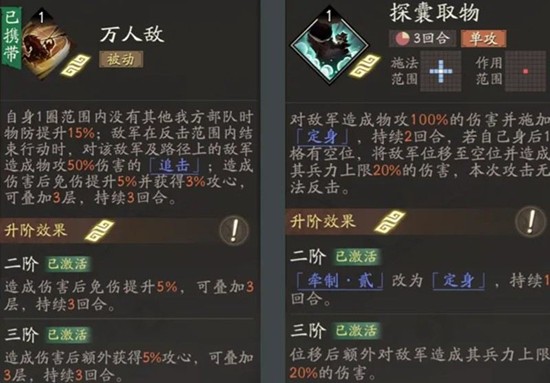 万人敌是张飞的核心被动技能,需要在没有友军的情况下对敌方目标释放。使用后可以对敌人产生二次追击伤害,技能升级后能为自身或队友提供免伤辅助,回血效果也很显著。这两个技能的升级顺序对战斗结果有重要影响。