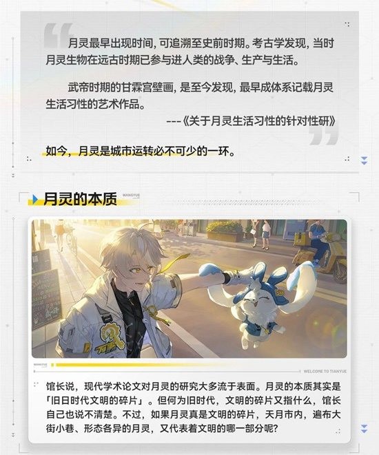 馆长说,现代学术论文对月灵的研究大多流于表面。月灵的本质其实是「旧日日时代文明的碎片」。但何为旧时代,文明的碎片又指什么,馆长自己也说不清楚。不过,如果月灵真是文明的碎片,天月市内,遍布大街小巷、形态各异的月灵,又代表着文明的哪一部分呢?