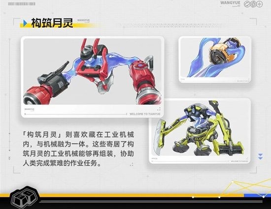 「构筑月灵」则喜欢藏在工业机械内,与机械融为一体。这些寄居了构筑月灵的工业机械能够再组装,协助人类完成繁难的作业任务。