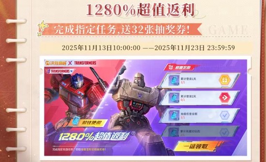 从11月13日开始,玩家不仅可以体验到全新的游戏内容,还有机会获得丰富的联动奖励。首次十连必得钢索的奖励更是让玩家充满期待。让我们共同期待11月13日的到来,一起加入这场变形金刚的冒险之旅吧!