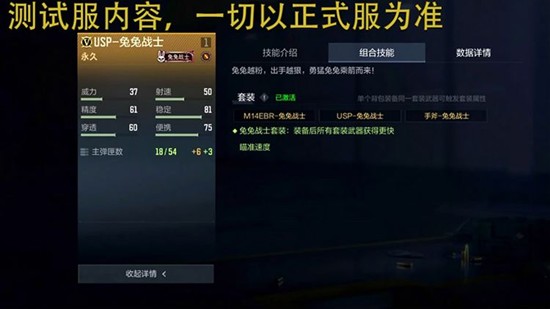 但该枪械共享兔兔战士套装带来的套装技能,在同时装备M14EBR-兔兔战士、USP-兔兔战士和手斧-兔兔战士后,即可激活该套装所有武器瞄准速度加快的能力。
