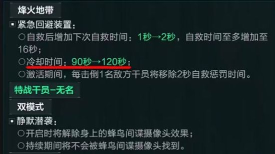 首先,疾风的紧急回避装置进行了调整。自救后增加下次自救时间从1秒延长至2秒,自救时间最多增加至16秒。这意味着玩家在使用紧急回避时需要更加谨慎,以免在关键时刻无法及时自救。冷却时间也从90秒延长至120秒,这进一步限制了紧急回避的使用频率。