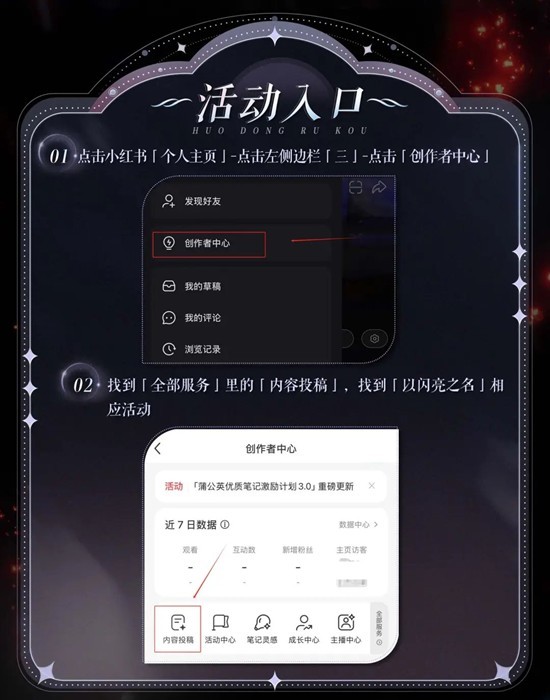 活动入口:小红书「个人主页」-左侧边栏「三」-「创作者中心」-「全部服务」-「内容投稿」