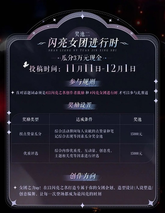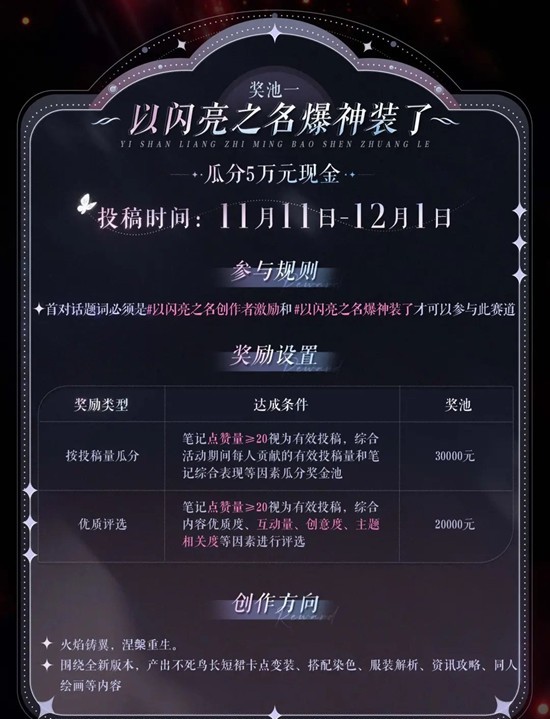 即日起带话题#以闪亮之名创作者激励 和各赛道指定话题,分享与《以闪亮之名》游戏最新版本相关的精彩创作,即有机会瓜分10万现金奖励。