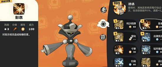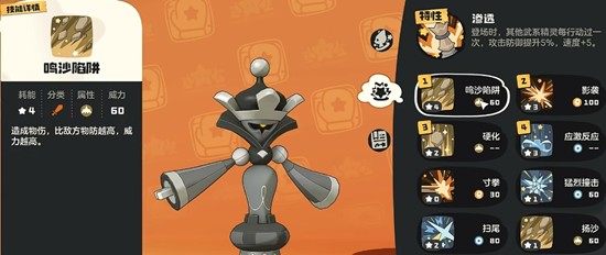 鸣沙陷阱是棋绮后核心的攻击手段之一,该技能不仅具备高额伤害,还能在自身防御叠加完成后对敌方造成毁灭性打击。由于棋绮后本身拥有较高的物防成长,配合防御增益效果后,使用鸣沙陷阱往往能在关键时刻斩杀满血对手。这一技能特别适合在棋绮后进入高防状态后释放,能够最大化其输出效率,在洛克王国世界对战中常作为终结技使用。