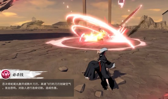 恋次释放终极技能时,蛇尾丸化作无数飞刃高速射出,划破空气发出尖锐鸣响,对前方大范围敌人实施多段切割打击。技能全程附带霸体效果,确保释放过程不被打断,适合在连招末端或关键时刻用来打出爆发伤害。必杀技动画华丽且实战表现强劲,是清理群体敌人或终结BOSS的关键手段之一。