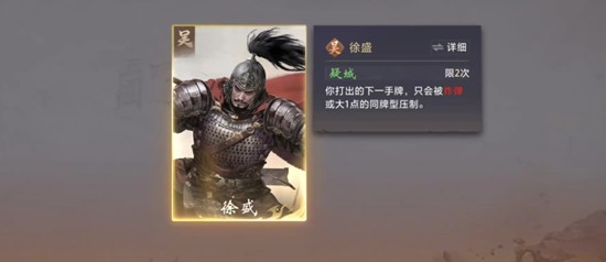 徐盛的核心技能名为疑城,该技能在整个对局中最多可触发两次。每当徐盛打出一张手牌后,下一张同花色或同点数的牌会自动变为“炸弹”效果。这一机制使得他在卡牌衔接上具备独特的爆发潜力,尤其是在手牌资源充足的情况下,能够通过连续出牌形成高额压制。由于游戏中真正能组成传统炸弹的组合较少,仅王和A具备天然炸型,因此徐盛的能力填补了普通牌型难以突破防线的短板。