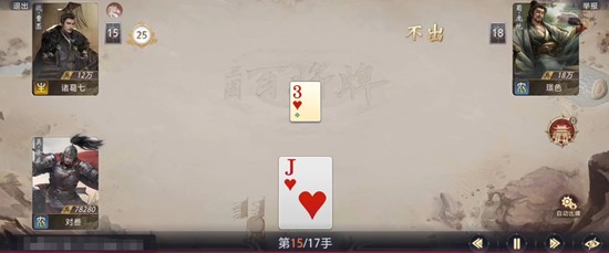 疑城的释放时机极为关键。虽然技能本身不消耗额外资源,但若在前期过早使用,可能无法最大化其收益。理想情况是在对局进入中后期、双方手牌减少时再启动技能效果,此时每一张牌的压制力都被放大。当对手只剩下两张或三张牌时,徐盛打出的一组连对配合技能转化的炸弹,往往可以直接打断对方出牌节奏,甚至直接奠定胜局。