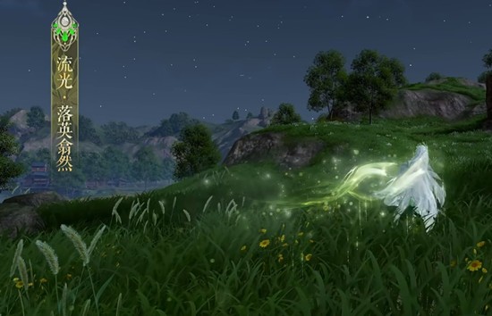 拖尾【流光·落英翱然】,以“仙迹不染尘,芳华曳裙裾”为设计灵感,行走时洒落碎钻晶尘,流光溢彩,为玩家的江湖之旅增添了一抹神秘色彩。