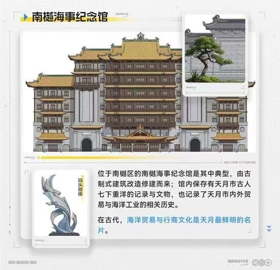 位于南樾区的南樾海事纪念馆是其中典型,由古制式建筑改造修建而来;馆内保存有天月市古人七下重洋的记录与文物,也记录了天月市内外贸易与海洋工业的相关历史。