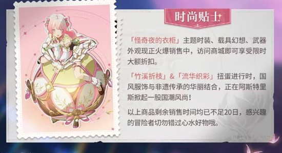 “怪奇夜的衣柜”、“竹溪折枝”、“流华织彩”等主题时装、载具幻想、武器外观正在限时销售中。这些外观不仅具有独特的设计,还能为冒险者们带来额外的属性加成。有意的冒险者请抓紧时间访问商店或扭蛋界面进行获取。