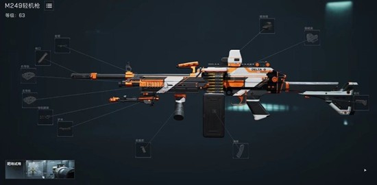 在三角洲行动中,M249轻机枪的改造主要涉及五个关键部位:枪口、前握把、倍镜、弹匣和枪托。