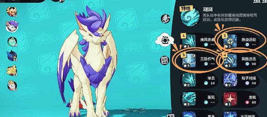 翼龙的技能配置同样为热身运动、三鼓作气与乘胜追击,需通过相同方式逐一获取并按顺序学习。这样在战斗中,翼龙能够与翼王形成技能联动,实现高层数buff叠加并打出连续攻击。但由于连击过程消耗能量较高,整个体系容易因能量不足中断节奏,因此必须加入一只携带湿润印记的水系精灵作为辅助。