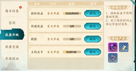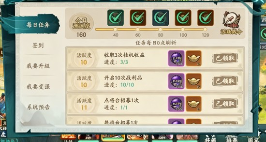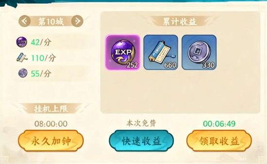 开局阶段应优先完成主线任务和每日任务,这两类任务不仅能提供大量经验,还能解锁关键功能系统。主线关卡的进度直接决定玩法开放顺序,比如阵法、装备强化、武将升星等模块都需要通过推进剧情来激活。同时,挂机收益最多可累积八小时,超出部分会被清空,因此建议定时登录领取,避免资源浪费。最佳领取时机是在完成当日主线后再一键收取,最大化利用离线产出。