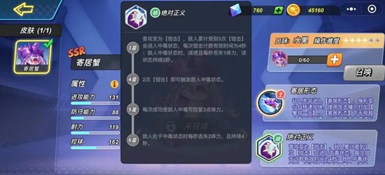 被动技能绝对正义为灌篮军团寄居蟹提供了持续压制能力。每次普攻命中会叠加中毒层数,三次普攻即可使目标中毒,中毒后敌人移速降低并持续掉血。当寄居蟹升至四星后,仅需两次普攻就能触发中毒效果,进一步提升了压制效率。在实战中,可利用对手落地硬直或投篮后的短暂僵直期进行快速普攻,安全地叠加被动,为后续抢断或反击创造条件。