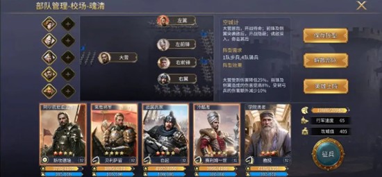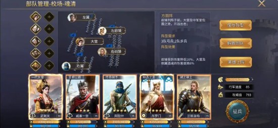 尖刀队强调高机动性与爆发输出,适用于快速突袭和侧翼打击。核心英雄为万王之王、霍去病、孙武和天下布武。霍去病的技能可使侧翼步兵移速提升80%,并减免35%远程伤害,有效解决传统步兵推进缓慢的问题。万王之王能为骑兵提供减伤效果,而孙武与天下布武则承担主要输出任务。搭配武器兵种后,整支队伍能在短时间内打出高额爆发。需要注意的是,孙武在此阵容中地位关键,若未获得该英雄,不建议强行组建此套英雄之城3阵容搭配。
