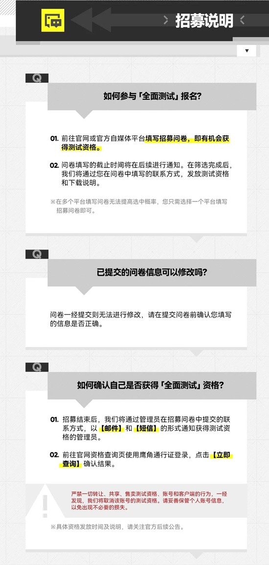 严禁一切转让、共享、售卖测试资格、账导和客户端的行为,一经发现,我们将取消该练号的息试腐格。请安善保管个人账号信息,以免出现不必爱的损失。