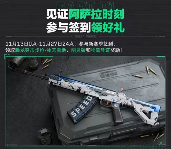 玩家参与新赛季签到,即可领取腾龙突击步枪-冰天雪地、图灵砖和物流凭证等奖励。