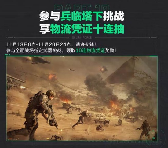 参与全面战场指定武器挑战,领取10连物流凭证奖励。