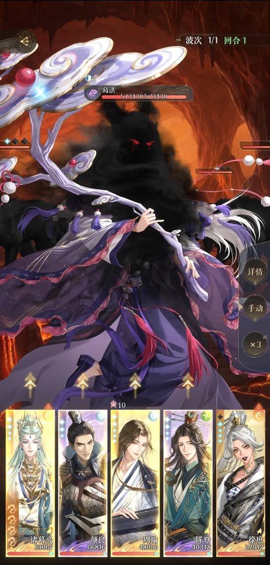 主要思路:开局葛洪会有5层盾(如p2葛洪头顶),有盾在的情况下打他不痛,但是打掉一次小怪会打掉一层盾,最好有群攻密探,第一回合放大招打死小怪,这样葛洪会被打掉一层盾。
