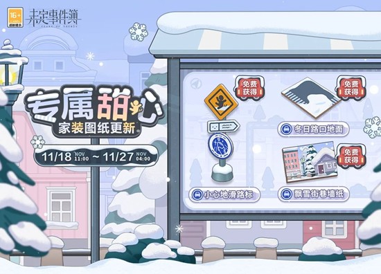 -甜心家装图纸:「飘雪街巷墙纸」、「冬日路口地面」、「小心地滑路标」