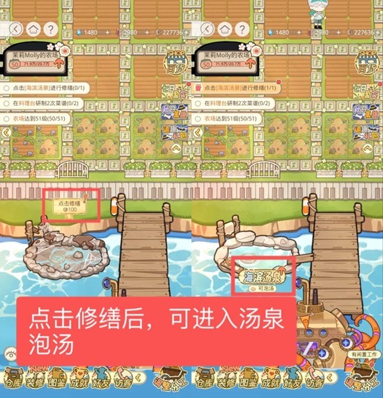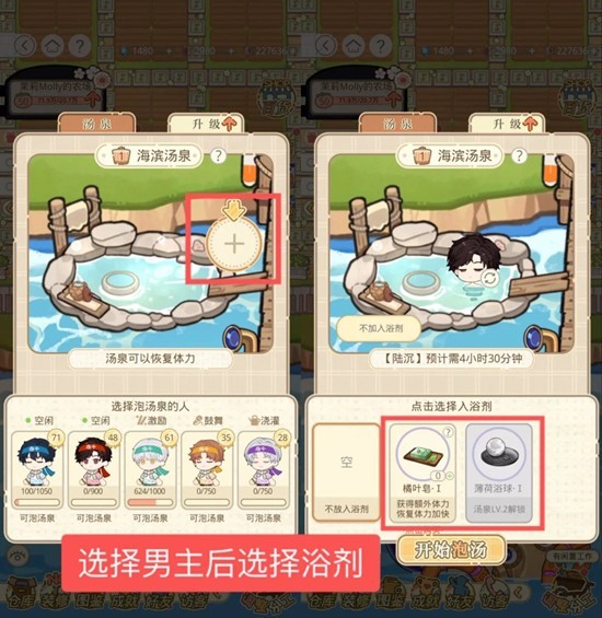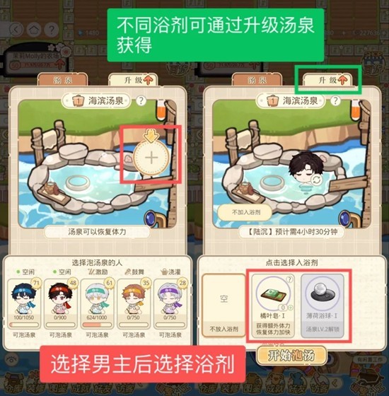 【海滨汤泉】:男主通过泡汤可恢复体力,通过升级获得的不同浴球有不同的加成。
