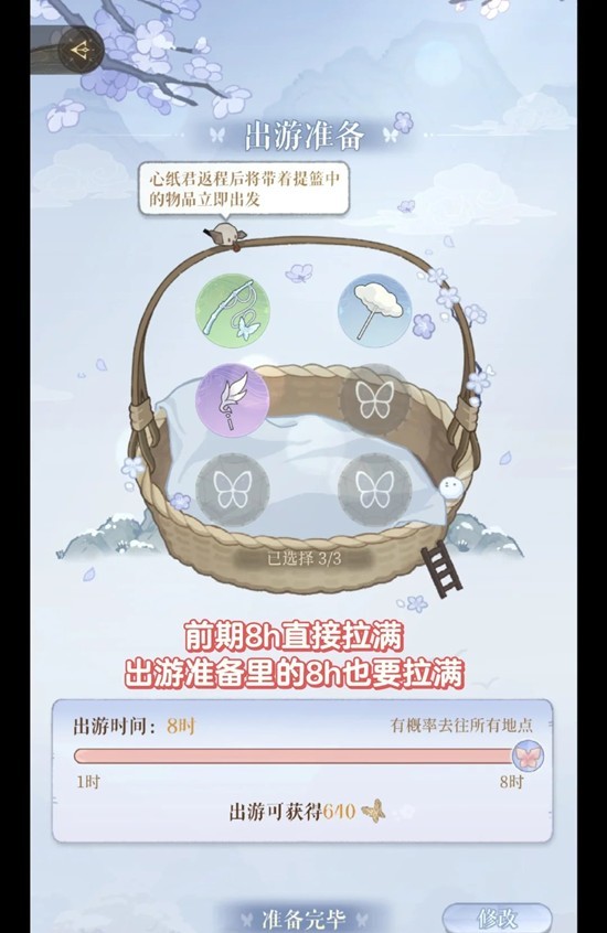 先过新手指引➡解锁地点➡点师尊放道具拉满8h➡点师尊旁边的小鸟提前放下一次8h派遣的出游物品(1次派遣16h,只要睡前登陆在放置下一次8h就OK)