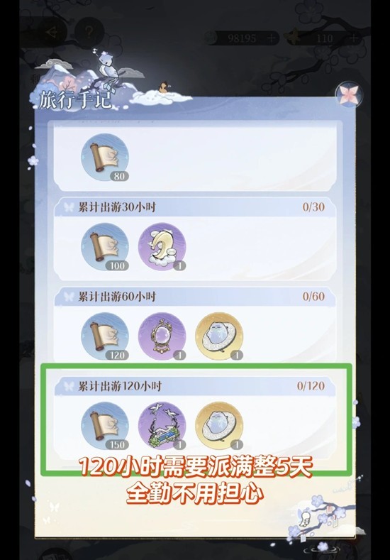 “累计出游120小时”此奖励需要我们拉满5天,全勤不需要担心