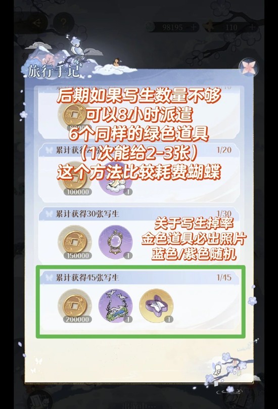 “累计获得45张写生”此奖励完全看掉率