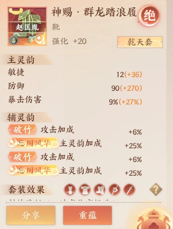 乾天这个装备的适配性很低,目前能带的名仕很有限,朱元璋赵匡胤、木兰、溜车,就这几个能带,也可以往后放,资源充足的情况下可以洗。