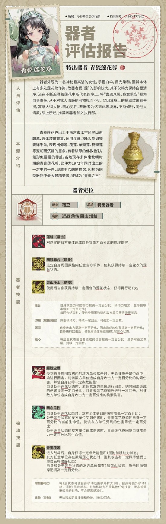 物华弥新游戏中有着众多角色,他们被称为“器者”,分为轻锐、远击、宿卫、构术、战略五个职业,特出、优异、新生三种稀有度。那么游戏中新器者青瓷莲花尊应该怎么用呢?小编为你准备了一份攻略,一起来看看吧~