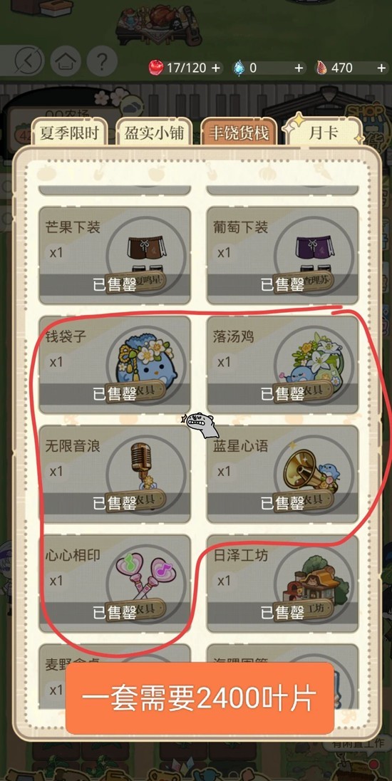 ①优先用叶片兑换一套农具(共需2400叶片)