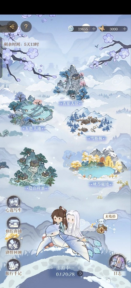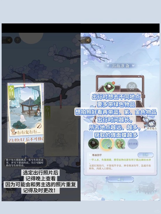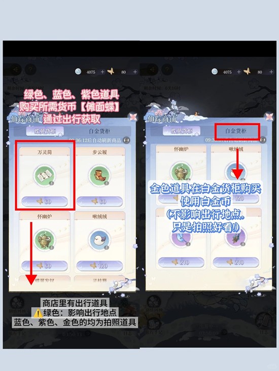 携带【绿色】道具出行几次后解锁更多可携带道具格子,可以打开仙踪商铺使用【傩面蝶】购买出行道具