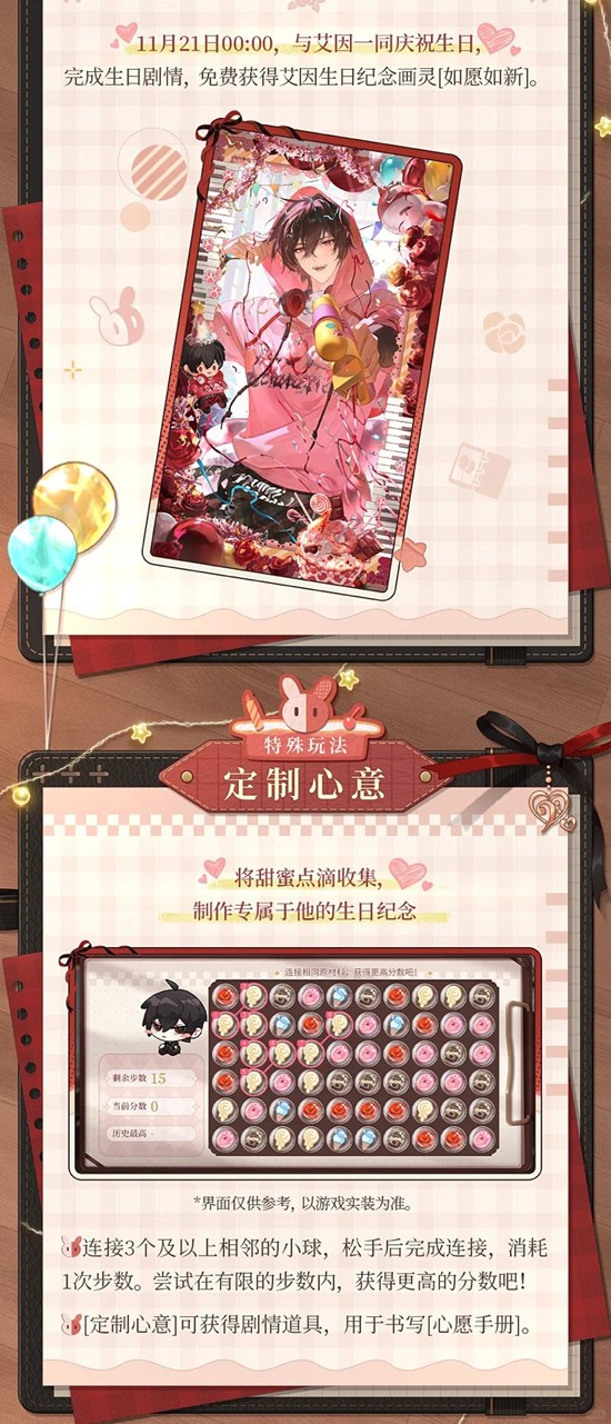 活动玩法:通过[主界面]-进入生日活动[烂漫新世代],与艾因一起回到钟灵屿,收集艾因过往的心愿,触发剧情与事件,将收集到的那些心愿与留言记录在[心愿手册]。