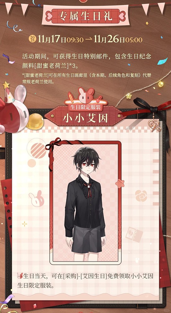 ► 11月17日09:30 - 11月26日05:00 ,2025艾因生日画廊「烂漫新世代」开启。画廊中SSR有且仅有艾因SSR[年少未满]、[黑色战车]、[不熄]、[檐下恋歌],无其他角色常驻SSR与SR。艾因SSR[年少未满]、艾因常驻SR画灵获取概率提升。