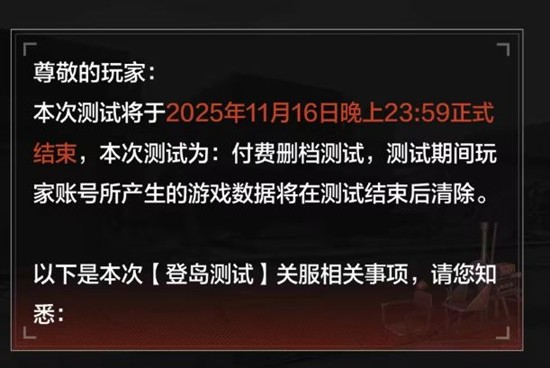 失控进化的登岛测试已于2025年11月16日晚上23:59正式结束。本次测试为付费删档测试,测试期间玩家账号所产生的游戏数据将在测试结束后清除。