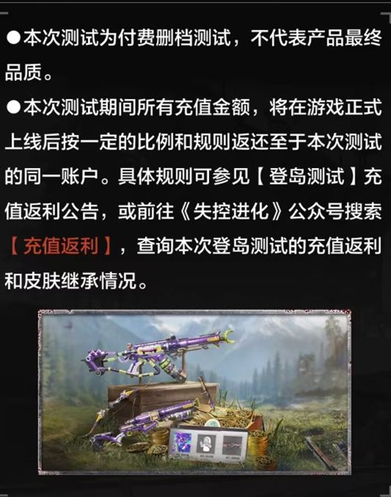 本次测试期间所有充值金额,将在游戏正式上线后按一定的比例和规则返还至于本次测试的同一账户。具体规则可参见【登岛测试】充值返利公告,或前往《失控进化》公众号搜索【充值返利】,查询本次登岛测试的充值返利和皮肤继承情况。