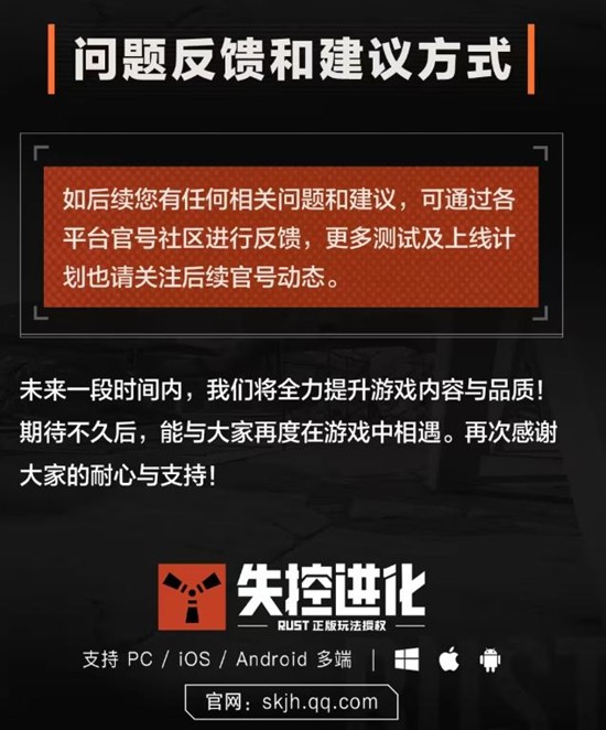 未来一段时间内,《失控进化》将全力提升游戏内容与品质!期待不久后,能与大家再度在游戏中相遇。再次感谢大家的耐心与支持!